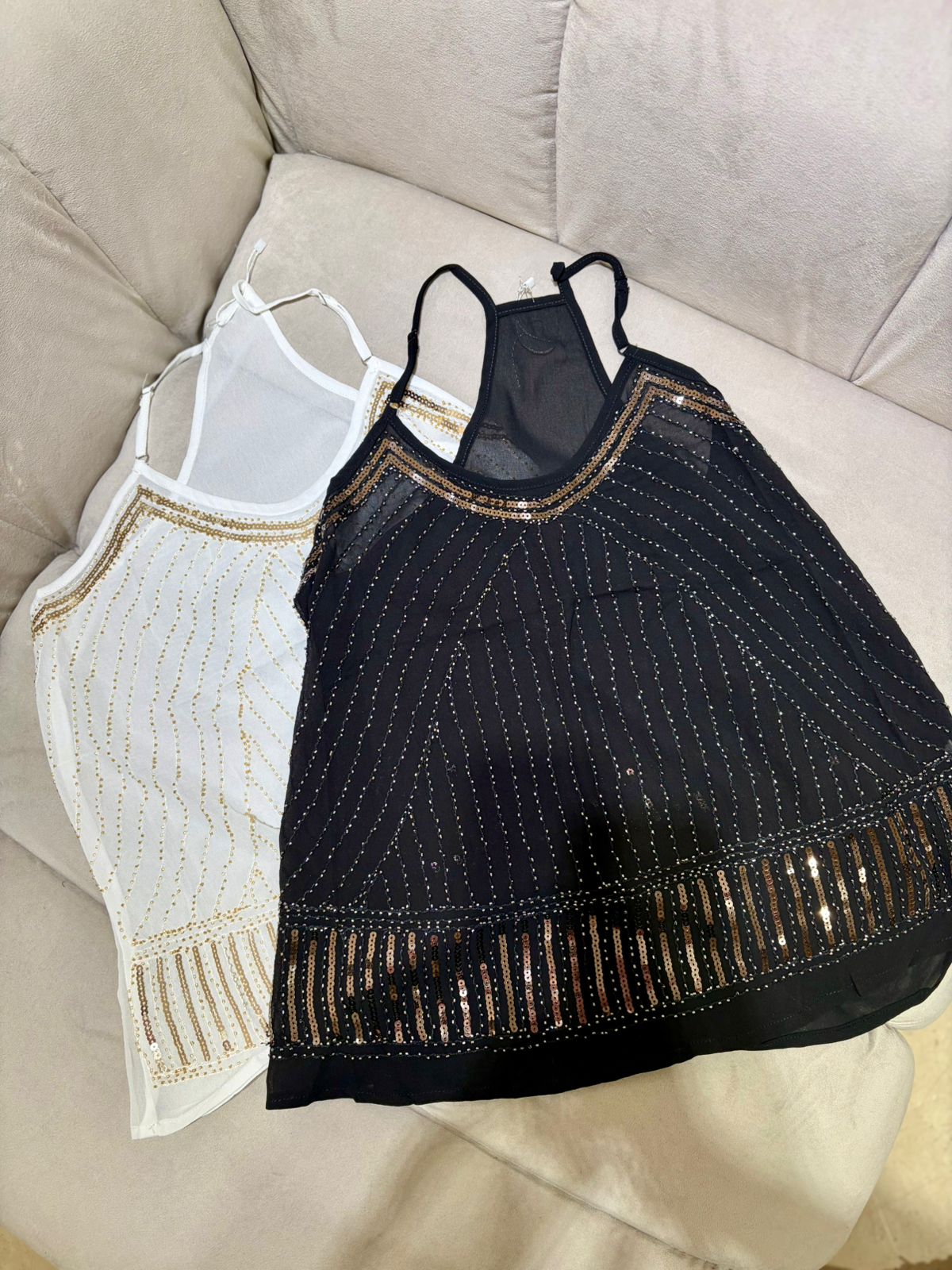 ART.112 musculosa de gasa con canutillos y lentejuelas. Tiene bretel regulable